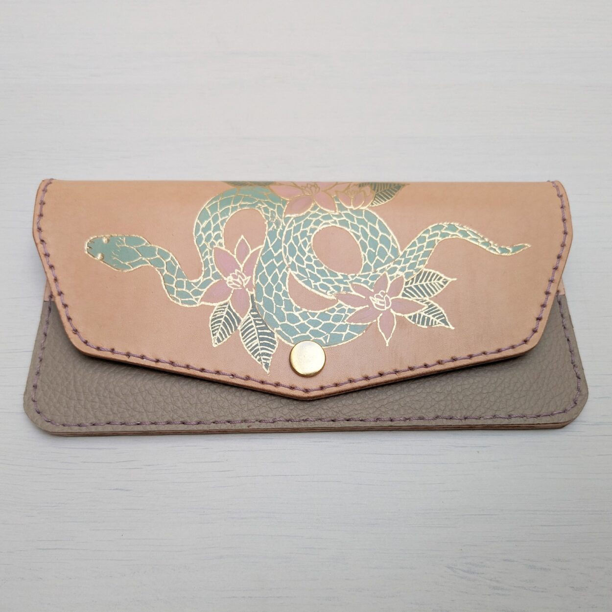 Featuring a hand painted floral snake design accented with gold detailing, this wallet keeps you organized with four card slots, an inner cash pocket and back document pocket to keep daily essentials handy. Hand stitched and fully finished with UV and water resistant coating to ensure your treasures will be kept safe for years to come.