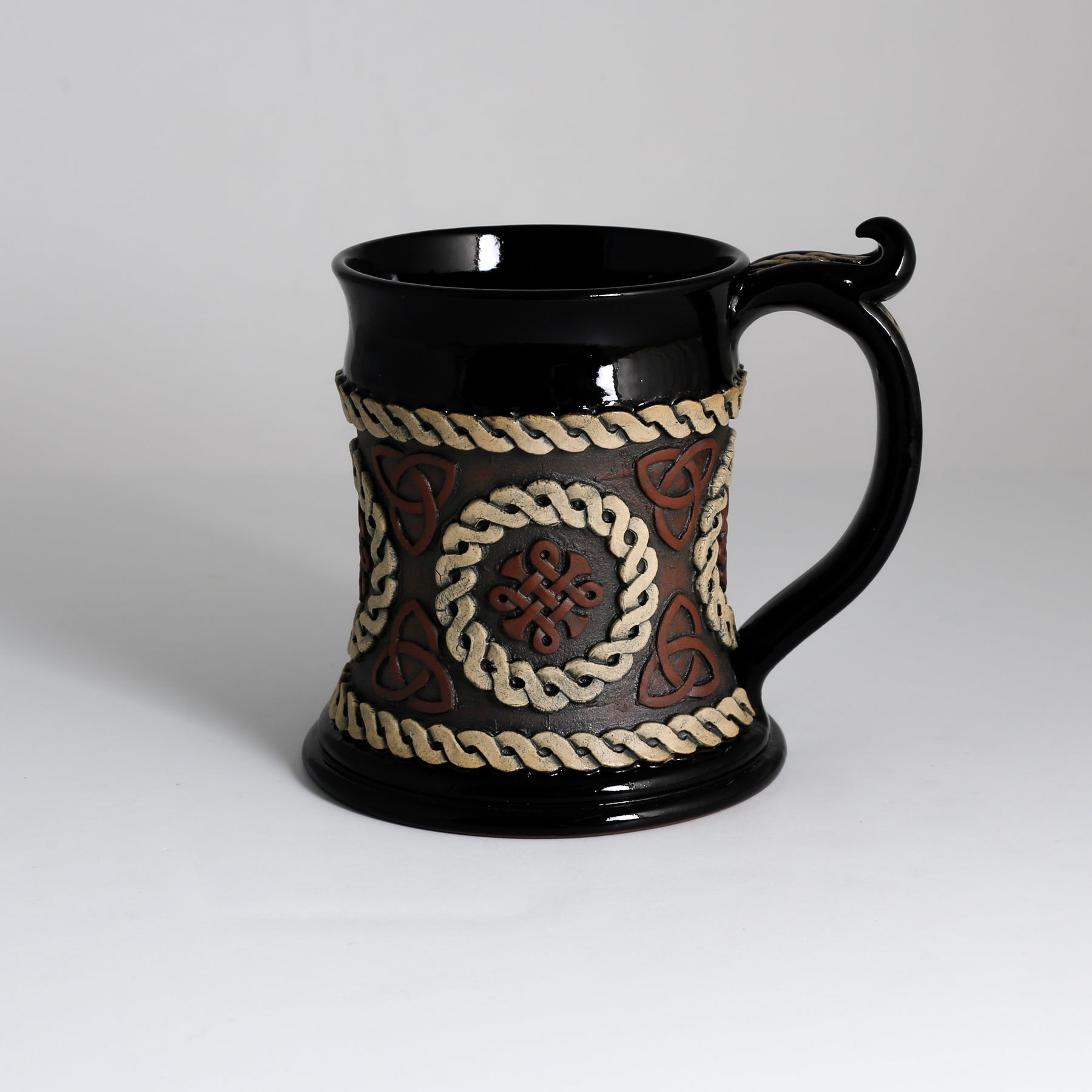 Stein, Red stoneware with white & red sprig - Black liner glaze.