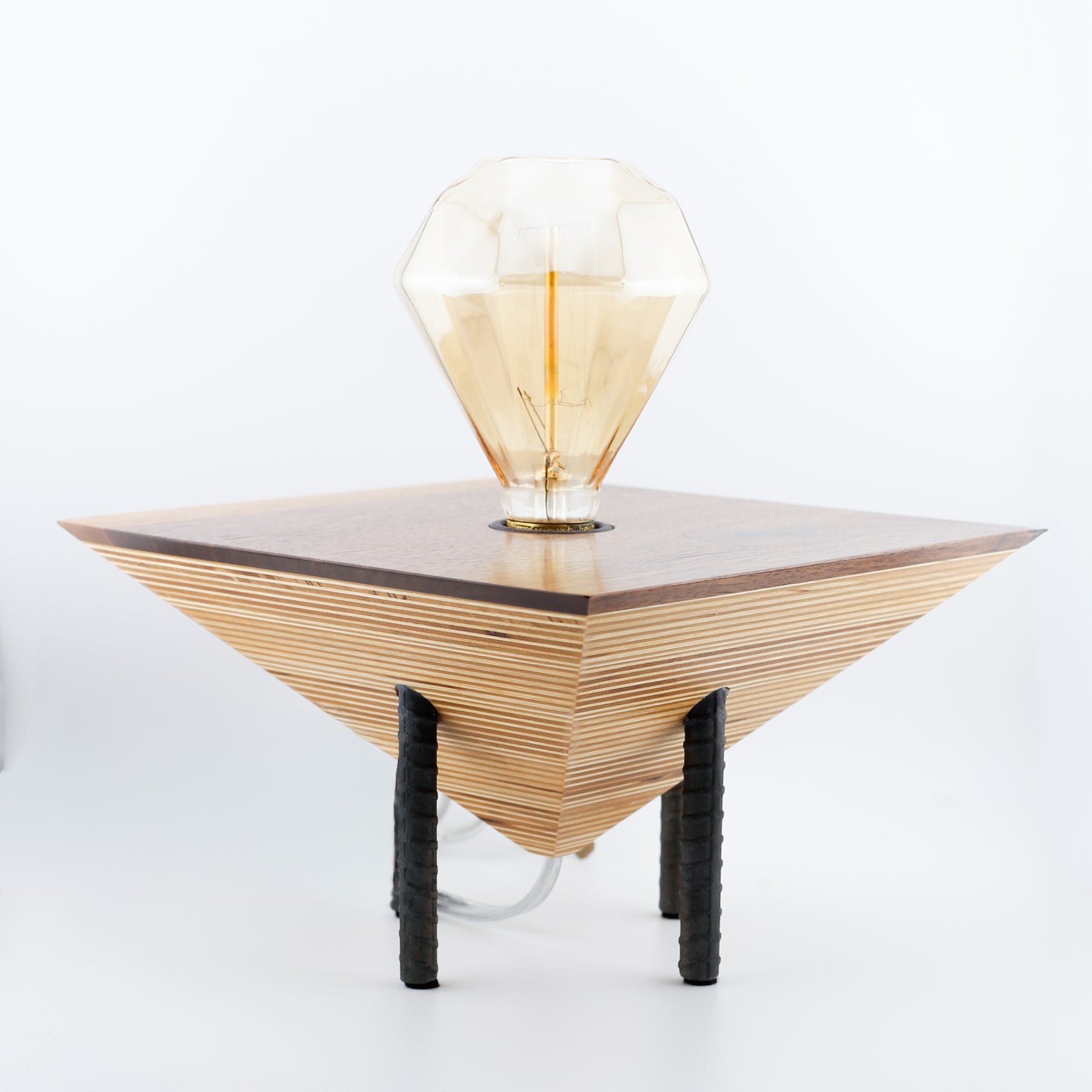 The Pyramid Lamp is created from walnut hardwood, baltic birch plywood, steel rebar, and features an "Edison" lightbulb with an inline dimmer switch.
