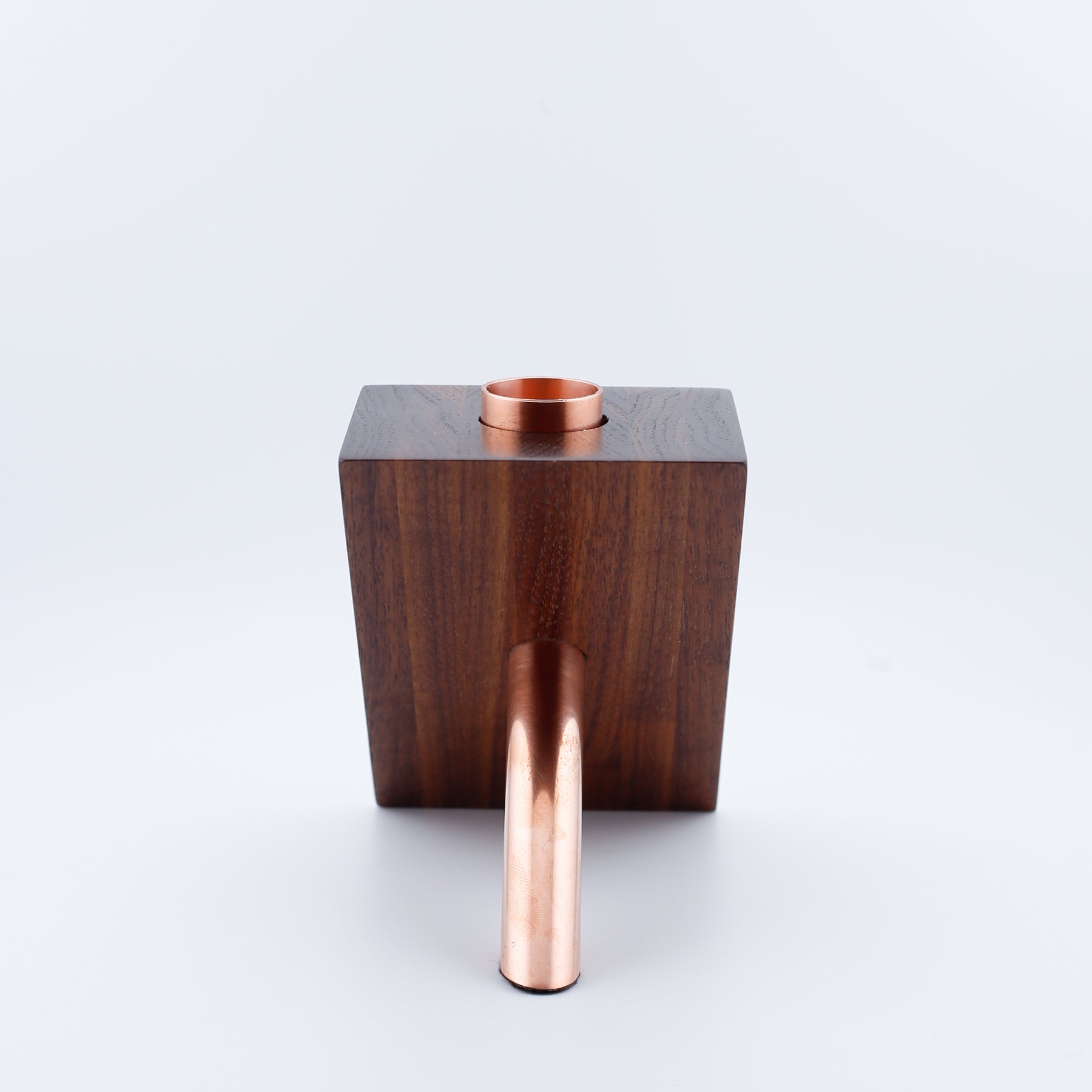 This candle holder is made with Walnut and copper. Fits a single candle.