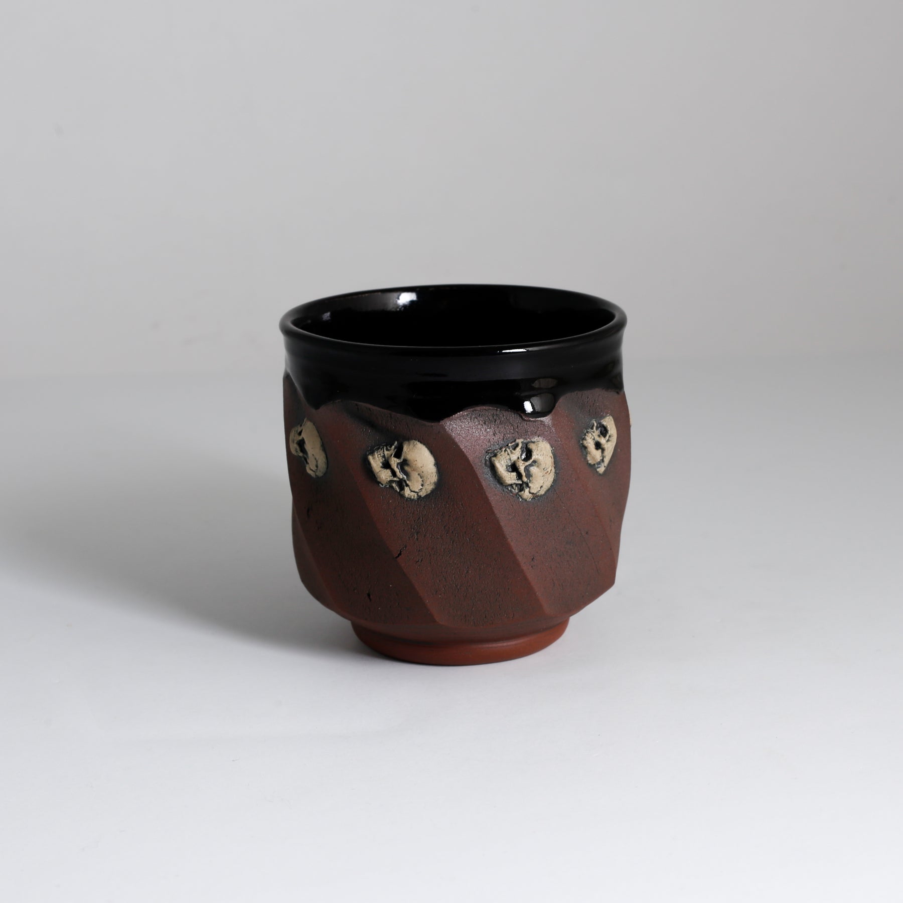 Faceted red stonware with white sprigged skulls - Black liner glaze