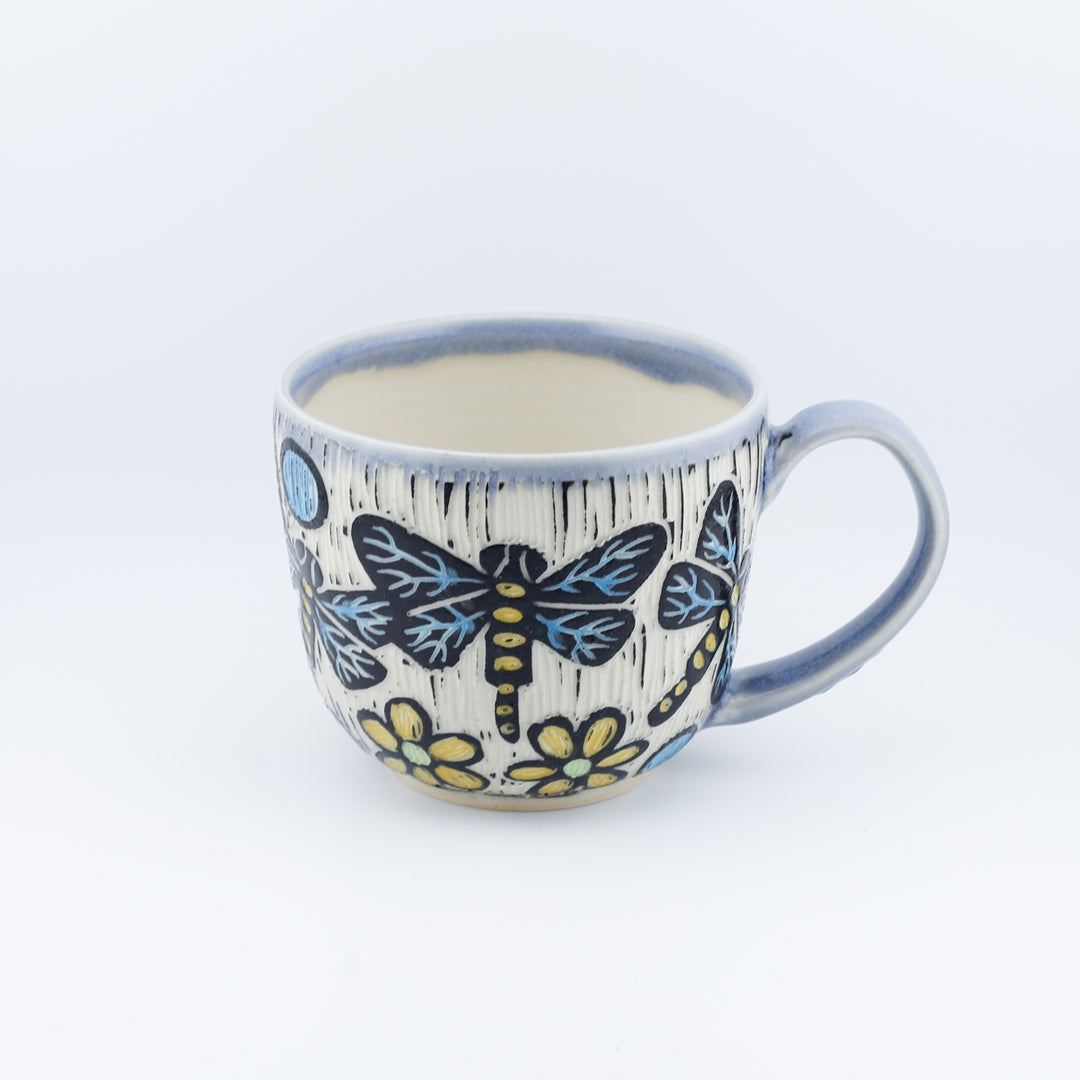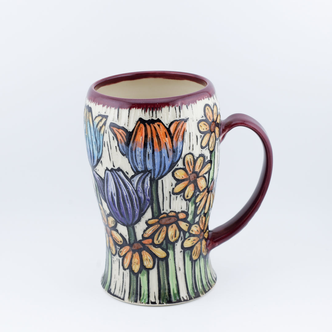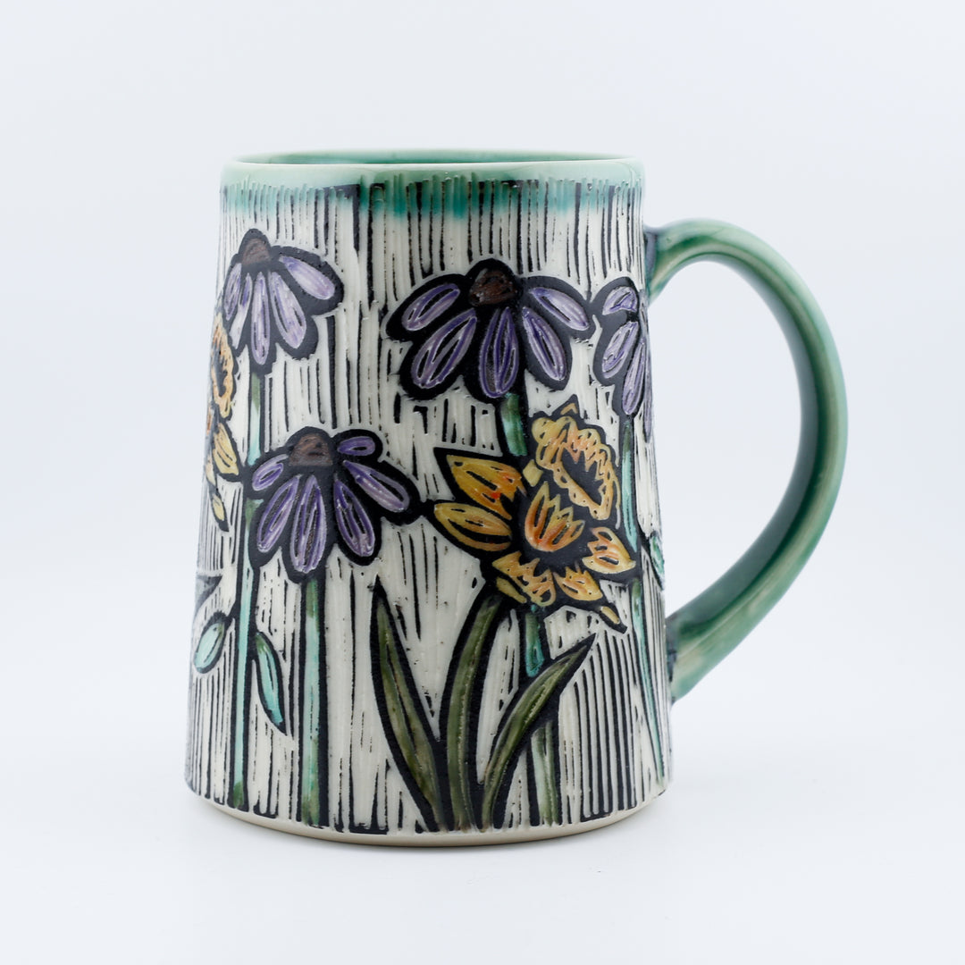 Her unique work is all wheel-thrown, covered in black slip, and hand-carved using the sgraffito technique. She works in a porcelain stoneware clay body, and all of her glazes are formulated from her own recipes.