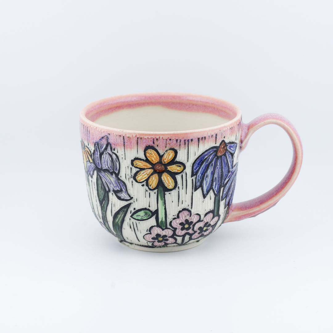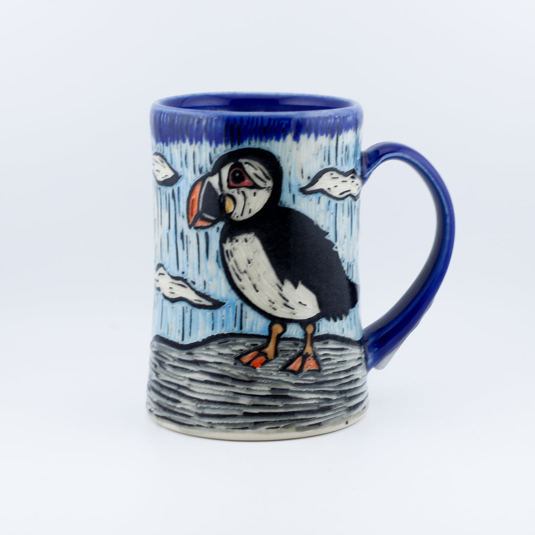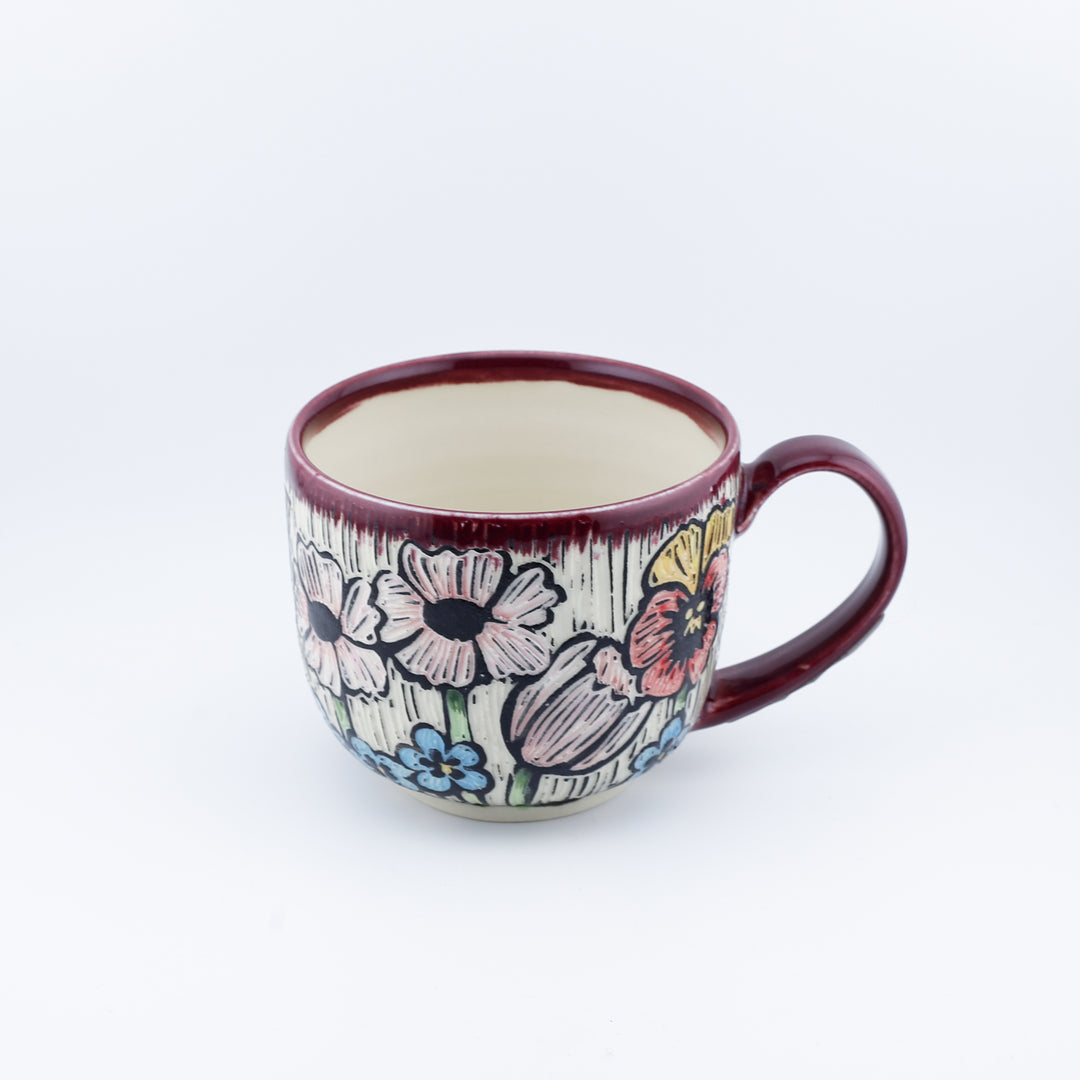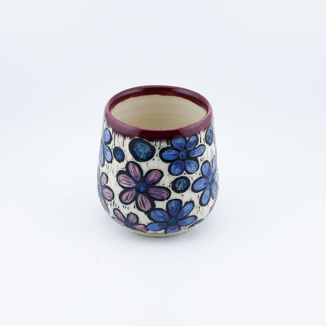 Her unique work is all wheel-thrown, covered in black slip, and hand-carved using the sgraffito technique. She works in a porcelain stoneware clay body, and all of her glazes are formulated from her own recipes.