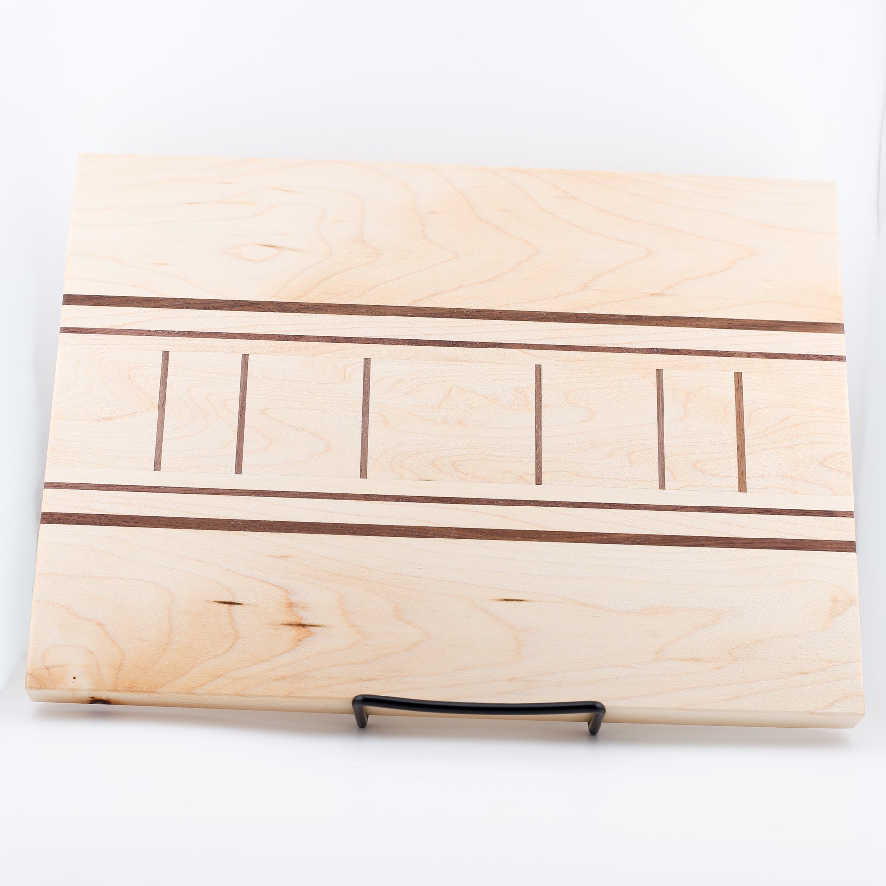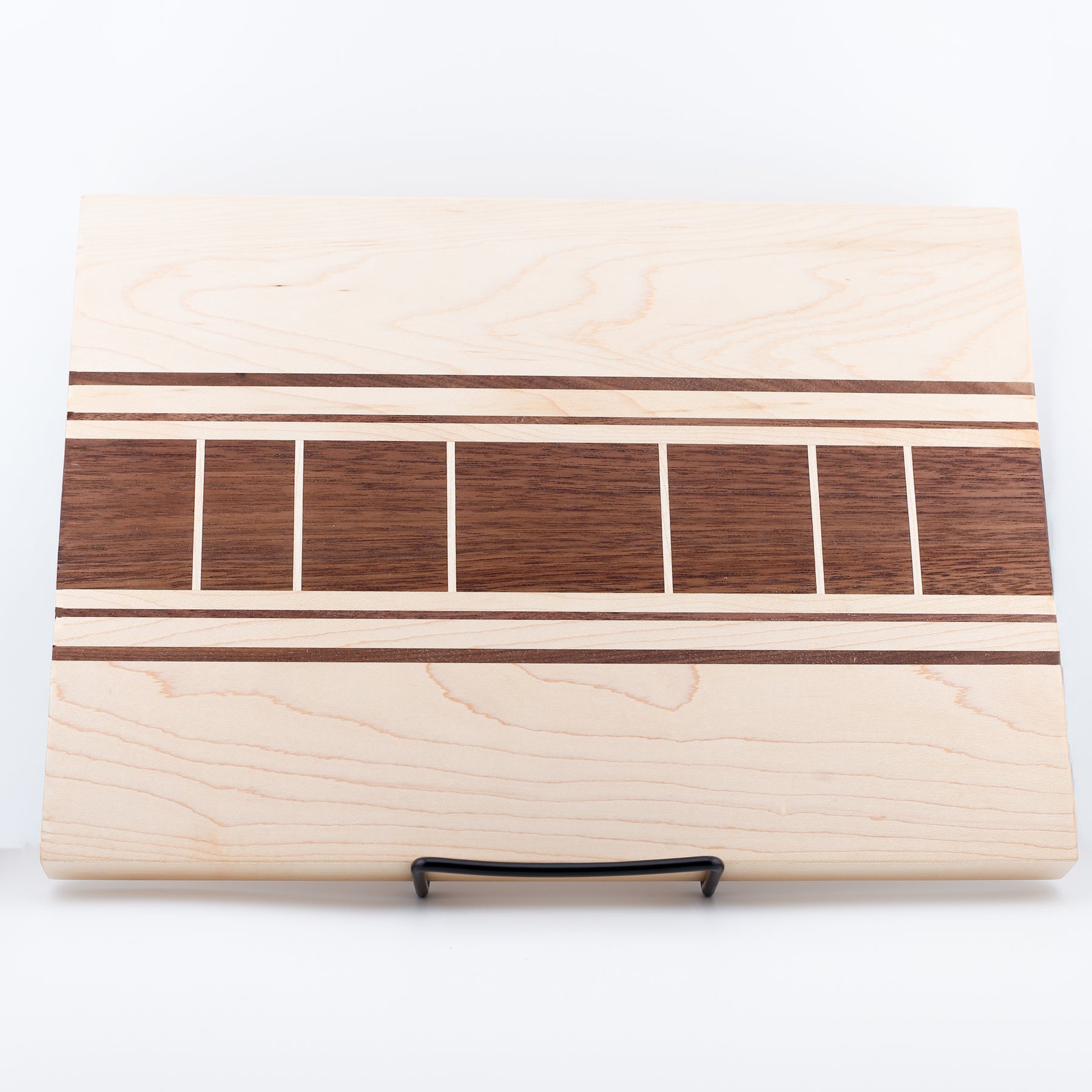 Maple is used to contrast and enhance the appearance of the darker laminations. Inlayed lines cross the central piece, creating a serving board with a strong but subdued presence.