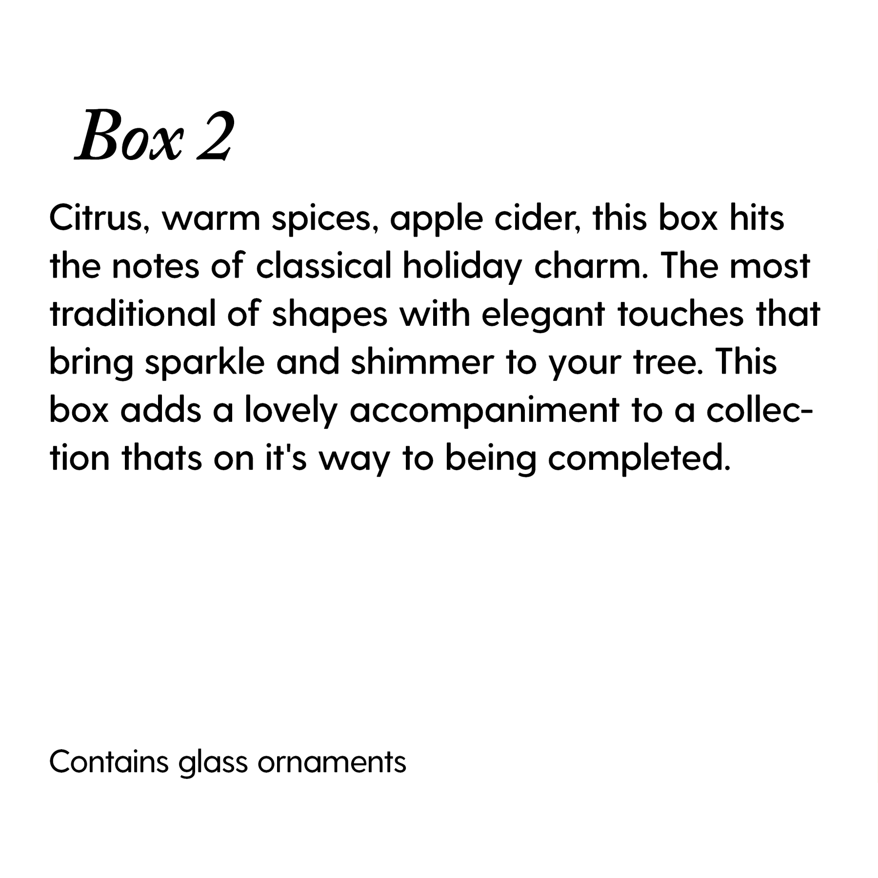 There is a minimum of 5 ornaments in each box. For more information on each box, view the image descriptions.