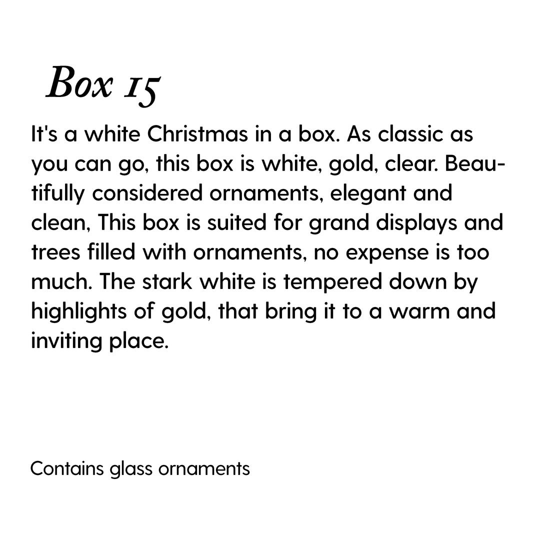 There is a minimum of 15 ornaments in each box. For more information on each box, view the image descriptions.