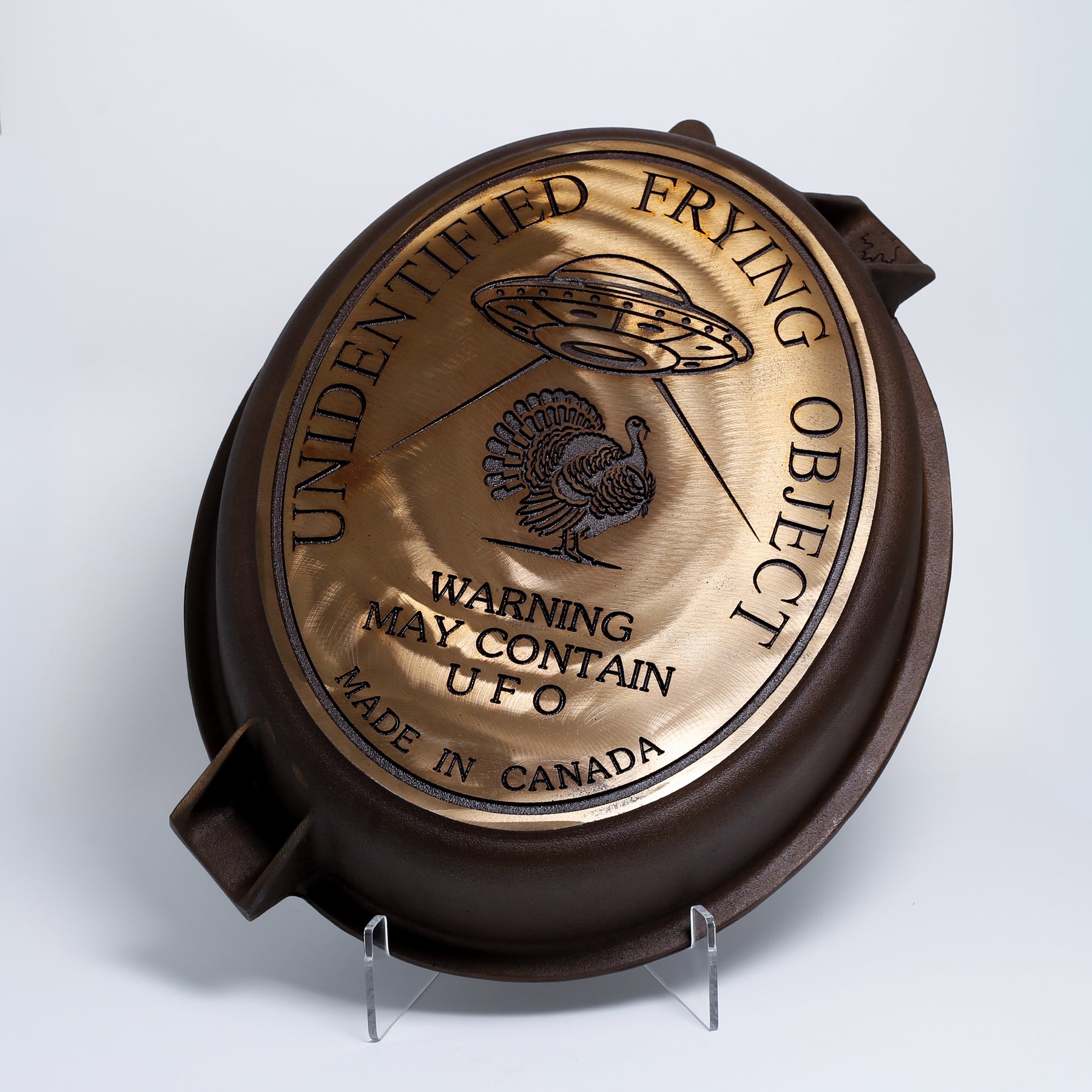 The unique seal on the bottom of the pan is "The unidentified frying object. Warning, may contain UFO" with a UFO beaming up a turkey.